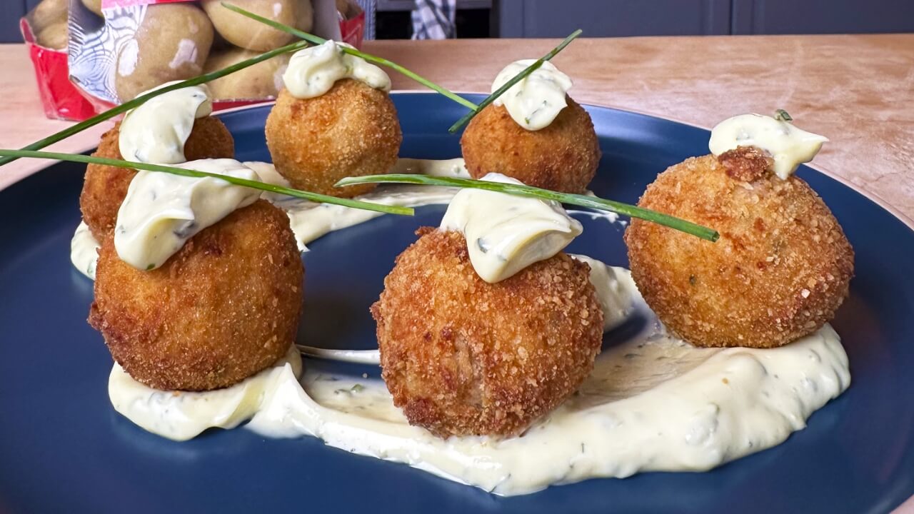 Ricetta: Polpette di polpo e patate con maionese alle erbe Preparazione Per realizzare le polpette di polpo e patate, mettete a cuocere il polpo facendo bollire dell’acqua con sale, cipolla, sedano, carota, foglie di alloro, salvia e un rametto di rosmarino. Fatelo cuocere per circa un’ora dopo di che fatelo freddare, pulitelo e passatelo nel tritacarne. Lessate le patate intere in acqua salata. Una volta pronte pressatele con lo schiacciapatate e mettetele in una terrina. Insaporitele con sale fino, parmigiano e prezzemolo fresco. Amalgamate il tutto ed aggiungete il polpo macinato. Per dargli una spinta in più aggiungete uno spicchio di aglio tritato. Create tante piccole palline della grandezza di una noce: impanatele prima nella farina, poi nel battocchio di latte e uova, poi nel pane grattugiato. Friggetele in abbondante olio di semi di girasole o strutto e fatele belle dorate. Preparate nel frattempo una maionese aromatizzata mettendo in un bicchiere frullatore l’uovo con sale, aceto e limone. Azionate il mix ed aggiungete a filo l’olio di semi di girasole. Una volta pronto amalgamateci le erbe aromatiche tritate finemente. Servite le crocchette di polpo belle calde con la maionese di accompagnamento.