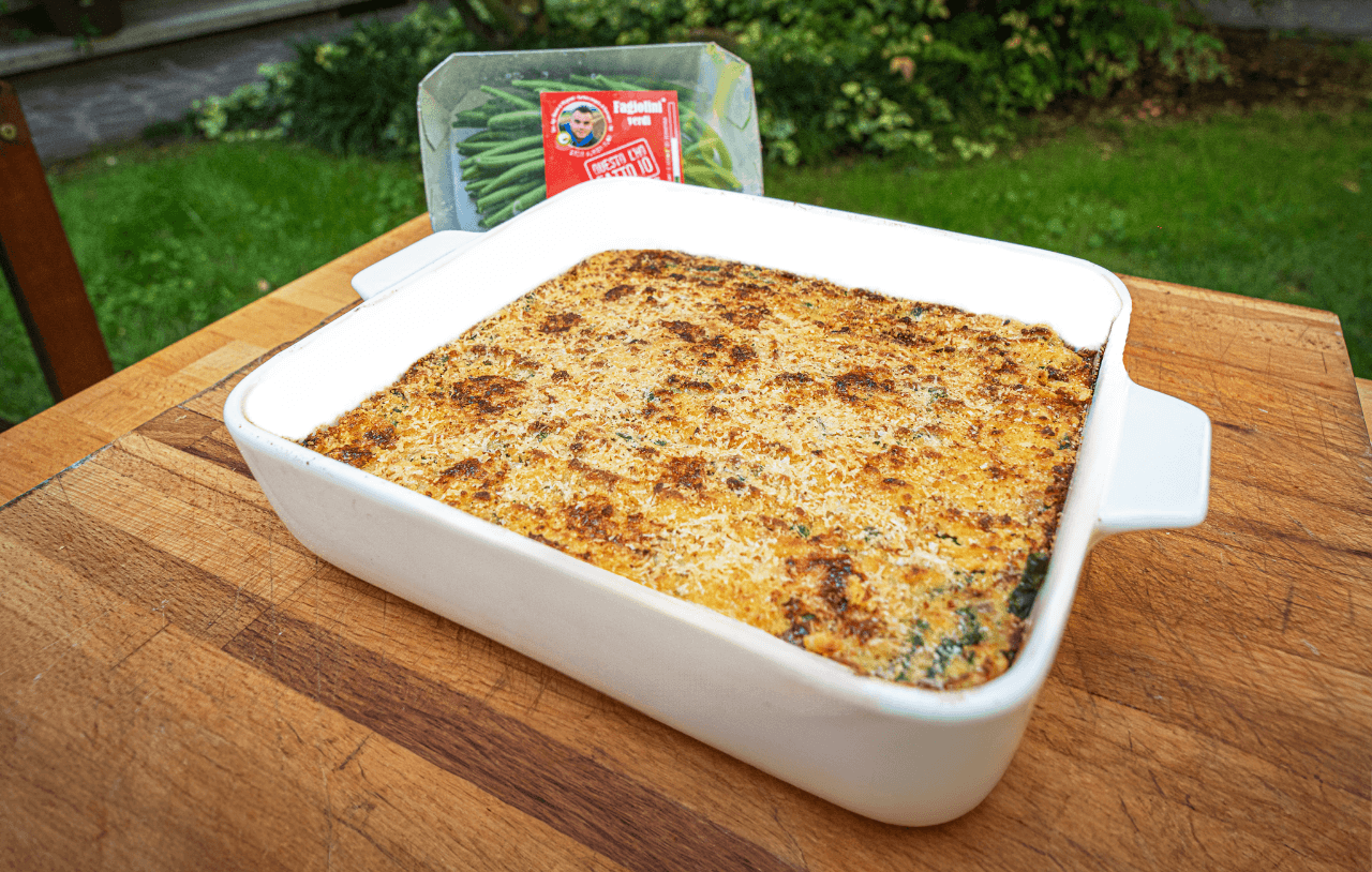 polpettone di fagiolini e patate, leggermente rivisitato. Questo piatto è un classico della cucina ligure, noto per l'abbondante utilizzo di verdure fresche e ortaggi; quindi, non possono mancare ingredienti di qualità, come quelli coltivati dai soci Agribologna.