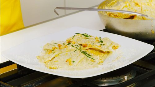 Ravioli di agretti e ricotta con crema alle noci