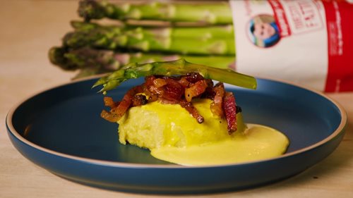 con crema di zafferano e guanciale croccante
