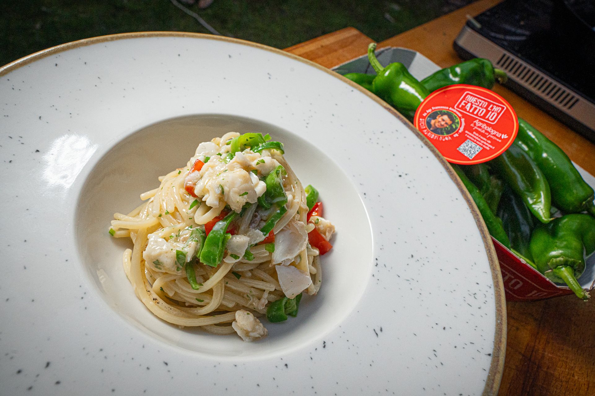 Ricetta: Spaghetti con friggitelli, branzino e pomodorini Preparazione Per realizzare gli spaghetti con friggitelli, branzino e pomodorini bastano cinque passaggi: Squamare ed eviscerare il branzino e ricavarne due filetti senza pelle Tagliare a julienne il friggitello e scottarlo in padella con un filo di olio insieme al branzino Preparare un fumetto di pesce tostando sedano, carota e cipolla in padella poi aggiungere acqua freddissima o ghiaccio e gli scarti del branzino Usare il fumetto come liquido per risottare lo spaghetto precedentemente cotto in acqua salata per metà del suo tempo di cottura Quando lo spaghetto è cotto aggiungere il branzino con i friggitelli, il datterino tagliato a cubetti e mantecare con olio evo e prezzemolo tritato.